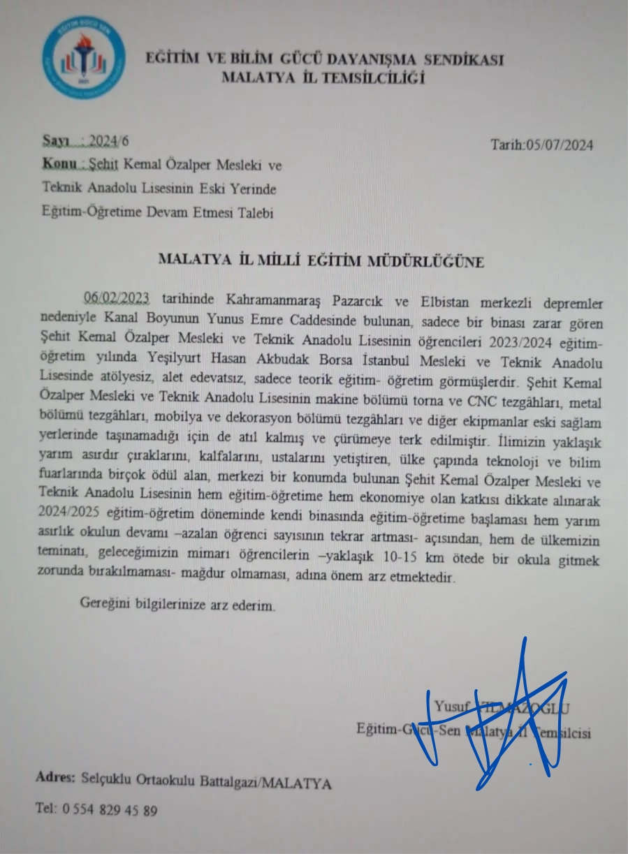 Eğitim Gücü Sen Malatya İl Temsilciliği olarak, 05.07.2024 tarihli başvurumuzda Şehit Kemal Özalper Mesleki ve Teknik Anadolu Lisesinin deprem sonrası yaşadığı mağduriyetin giderilmesini ve okulun eski yerinde yeniden eğitim öğretime başlamasını talep etmiştik.